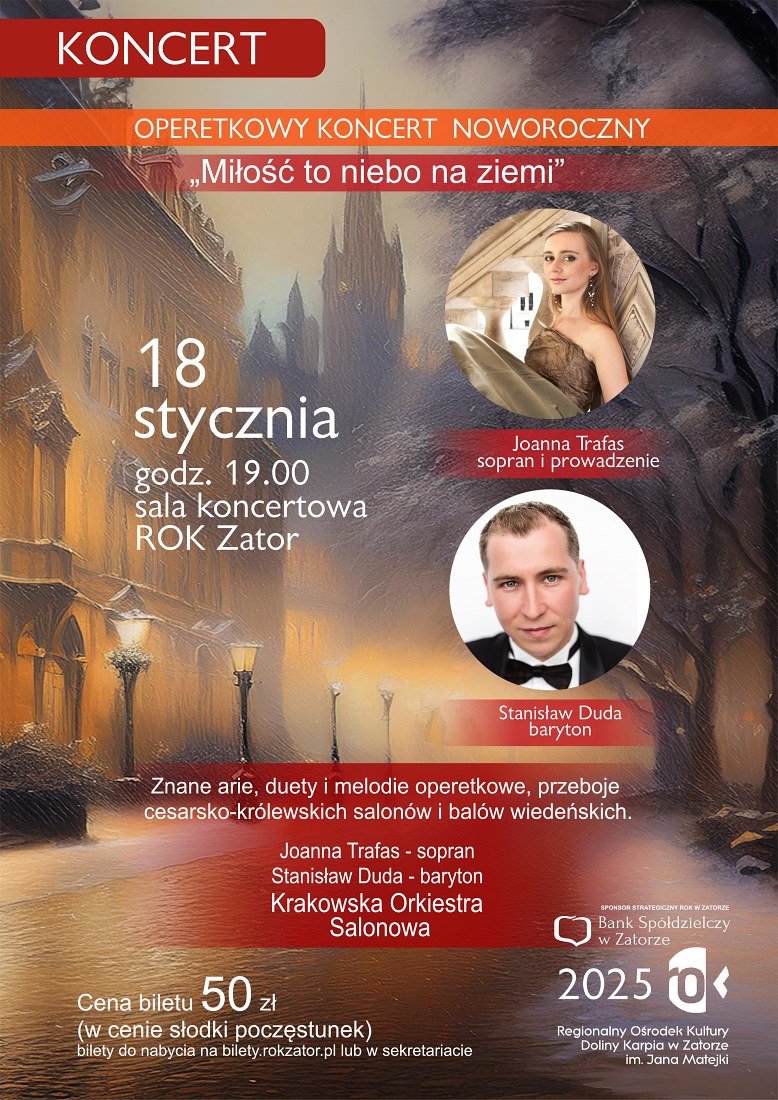 18 stycznia w sali widowiskowej ROK Zator wybrzmią arie, melodie operetkowe oraz przeboje cesarsko-królewskich salonów i balów wiedeńskich. Będzie to Operetkowy Koncert Noworoczny „Miłość to niebo na ziemi”.