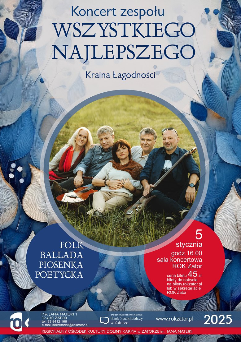 Już 5 stycznia koncert zespołu Wszystkiego Najlepszego – grupa tworzy i wykonuje własne piosenki z klimatu Krainy Łagodności, piosenki poetyckiej, ballady i folku. Takie piosenki jak „Taradajka”, „Jesienne oczekiwanie”, „Łapka niedźwiadka”,” Aniołowie Biali” i wiele innych, odnaleźć można w wielu śpiewnikach. Wszystkiego Najlepszego powstał lata temu i wyśpiewał wiele głównych nagród na najważniejszych festiwalach piosenki, przeglądach poezji śpiewanej czy piosenki studenckiej m.in. kilkakrotnie na Yapie, Bakcynaliach, na Danielce, na Giełdzie Piosenki w Szklarskiej Porębie, na Bazunie, Krakowskim Festiwalu Studenckim i wielu innych. Po latach przerwy zespół wrócił wydając w 2017 roku płytę „Na przekór przyszłej korekcie”, tworzy nowe piosenki i intensywnie koncertuje. W 2019 ukazała się kolejna płyta zespołu „Wygnani Poeci” , a 2023 roku światło dzienne ujrzał trzeci album „Małe miasteczka”. Autorami większości tekstów są zaprzyjaźnieni twórcy naszego regionu: Krysia Bernd, Aleksandra Bacińska, Krzysztof Kasperczyk oraz założyciel zespołu i autor muzyki Maciej Rzeźnikowski.